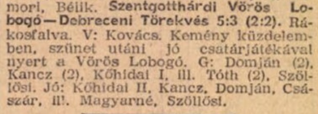 | 1956.07.15. | np. OBI | Szentgotthárd - Debreceni Törekvés | 5 - 3 |